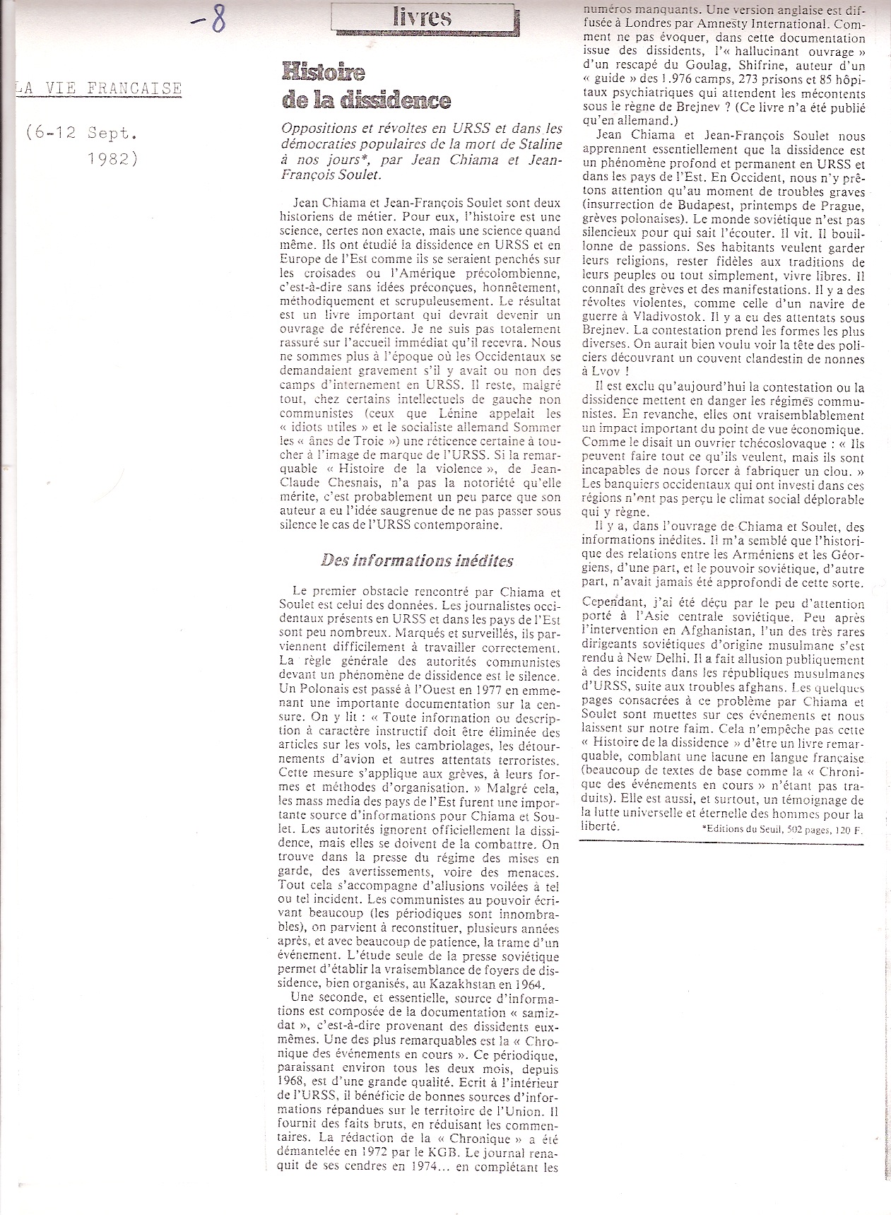 livres articles comptes rendus entretiens ROMANSA- COMPTES RENDUS « Histoire de la Dissidence » A- 1