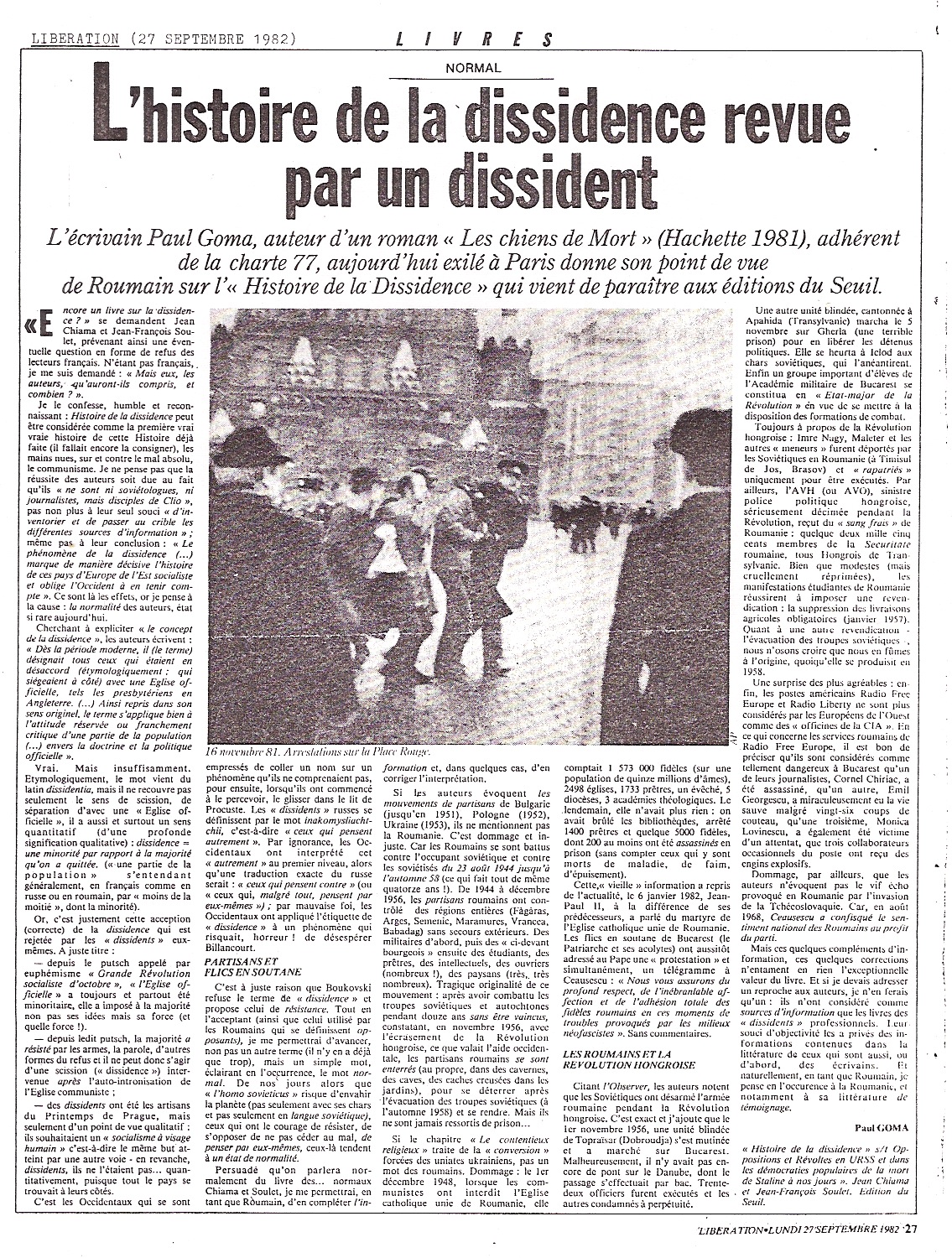 Libération, Paul GOMA, 27 septembre 1982, p. 27. A- 3