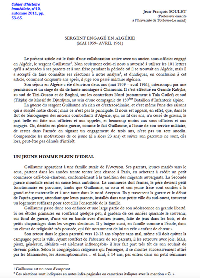 H- « Sergent engagé en Algérie (mai 1959-avril 1961) »Cahiers d’histoire immédiate, N°40, automne 2011, pp. 53-65)